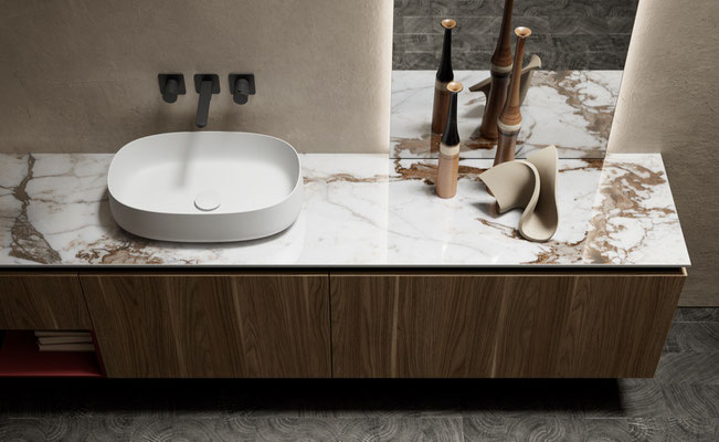 In questo modello, un nome volutamente altisonante a sottolineare la sua esclusività e ricercatezza, significativamente apprezzabile anche agli occhi dei meno esperti, che possono notare il top “fluttuare” a qualche centimetro di distanza dal mobile, grazie alla gola metallica su tre lati. Infinite possibilità di personalizzazione. Scopri di più...